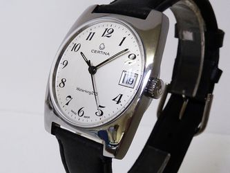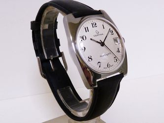 Certina handopwinder datum met zilverkleur wijzerplaat en lerenband.