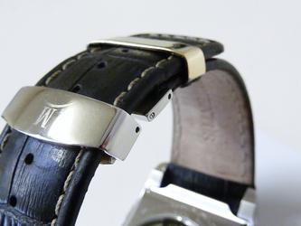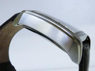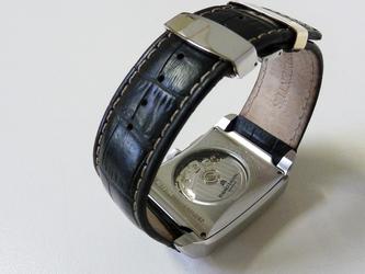 Edelstalenkast vierkant-model gewelfd saffierglas diameter 38,5 x 54,5 mm. met zichtvenster aan achterzijde en lerenband met edelstalen vouwsluiting.
