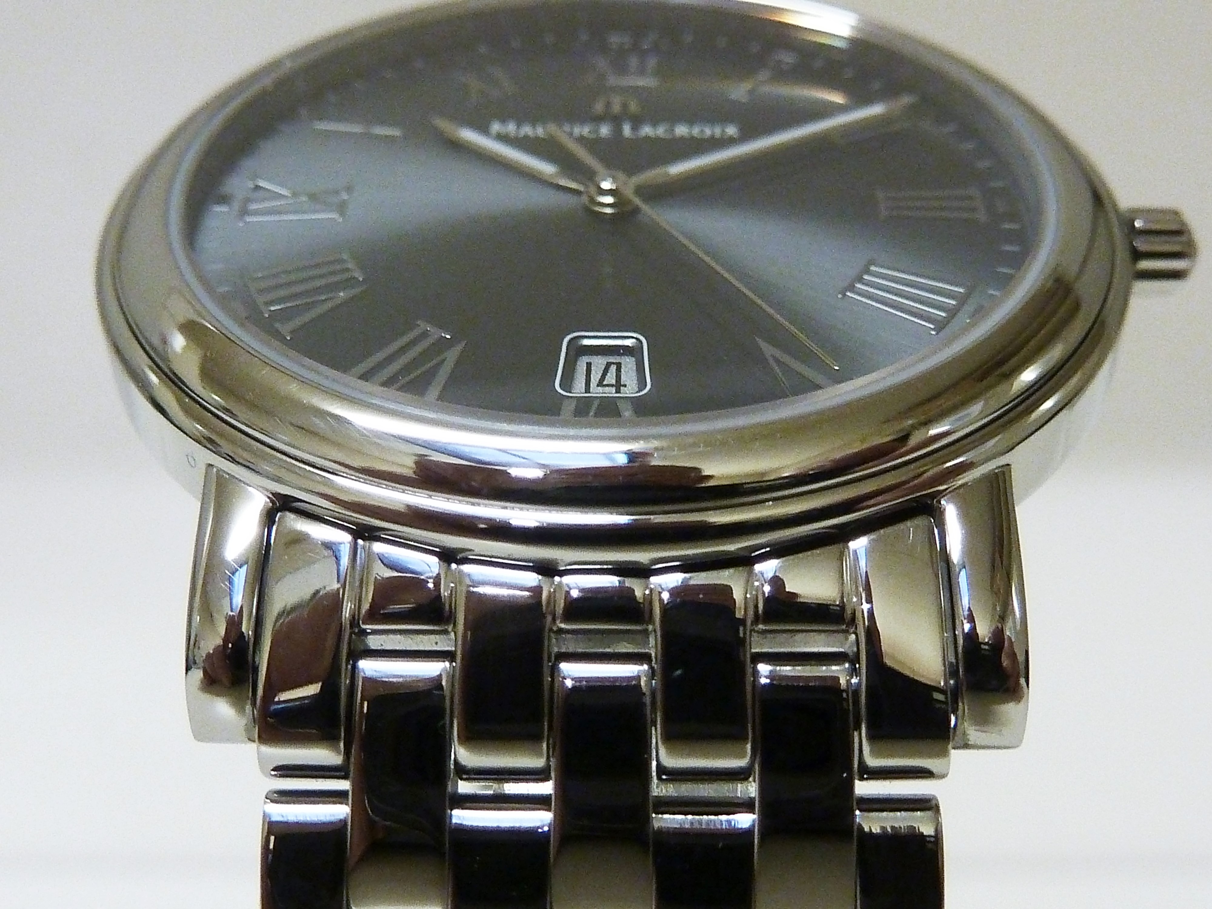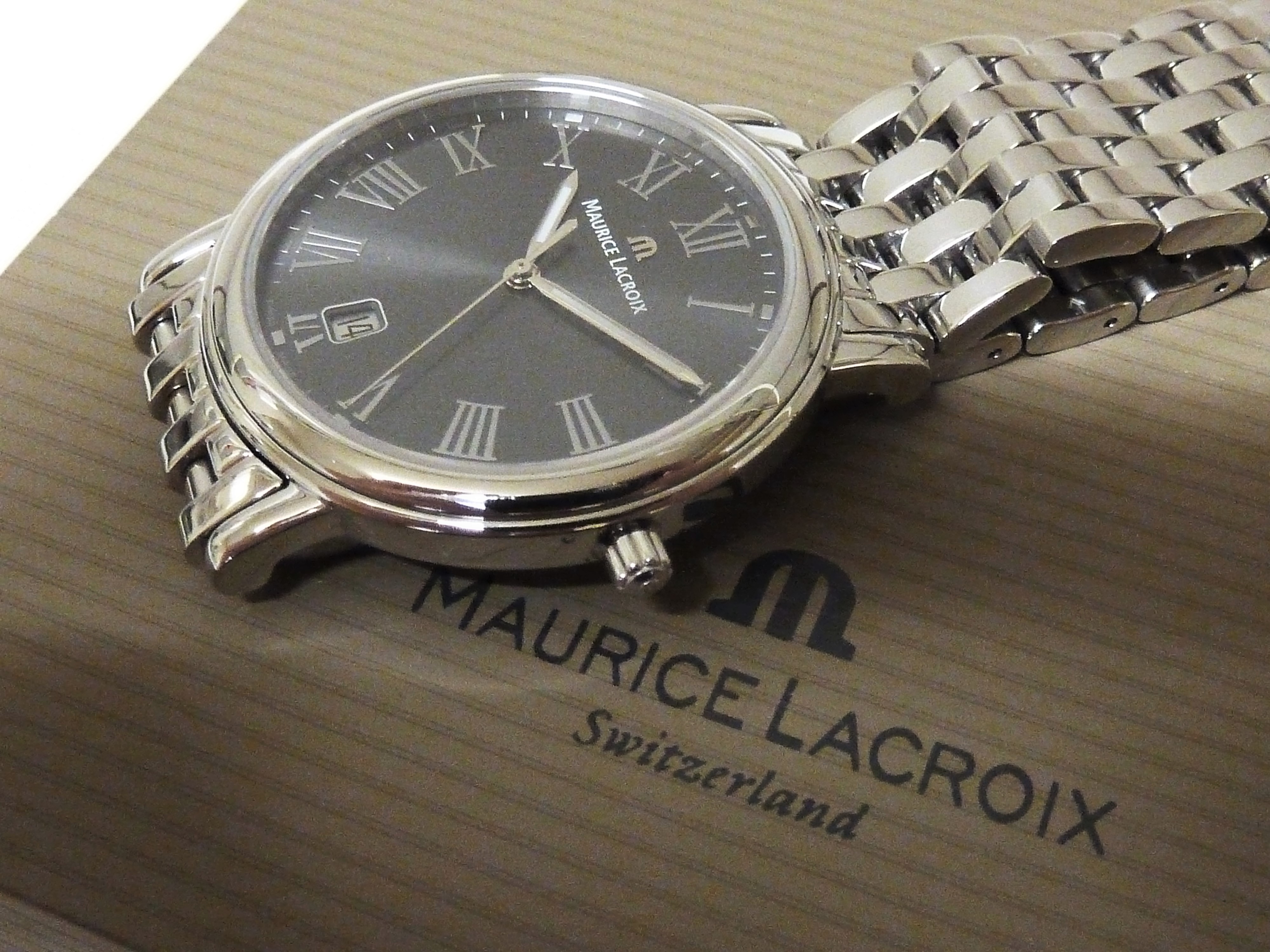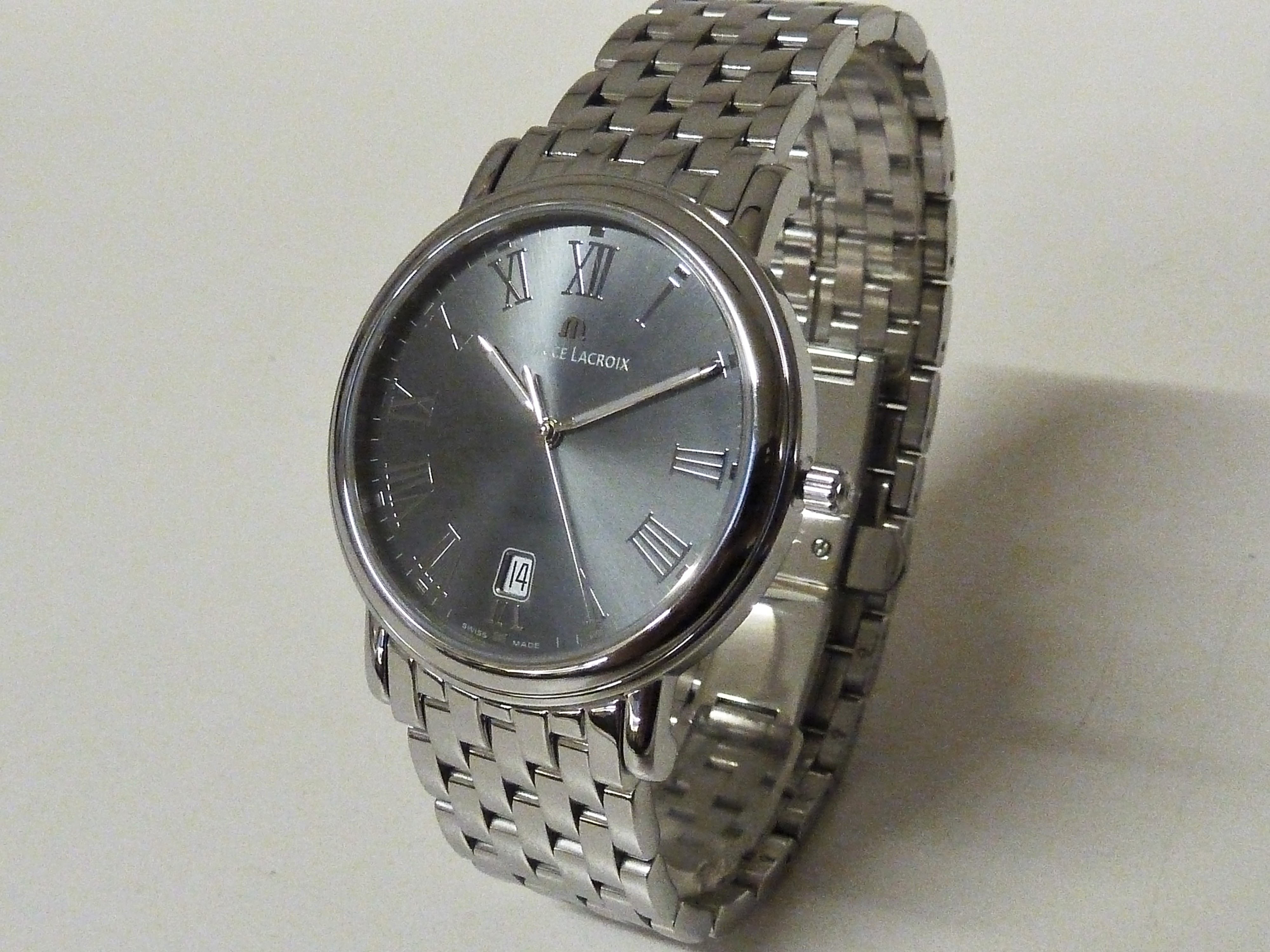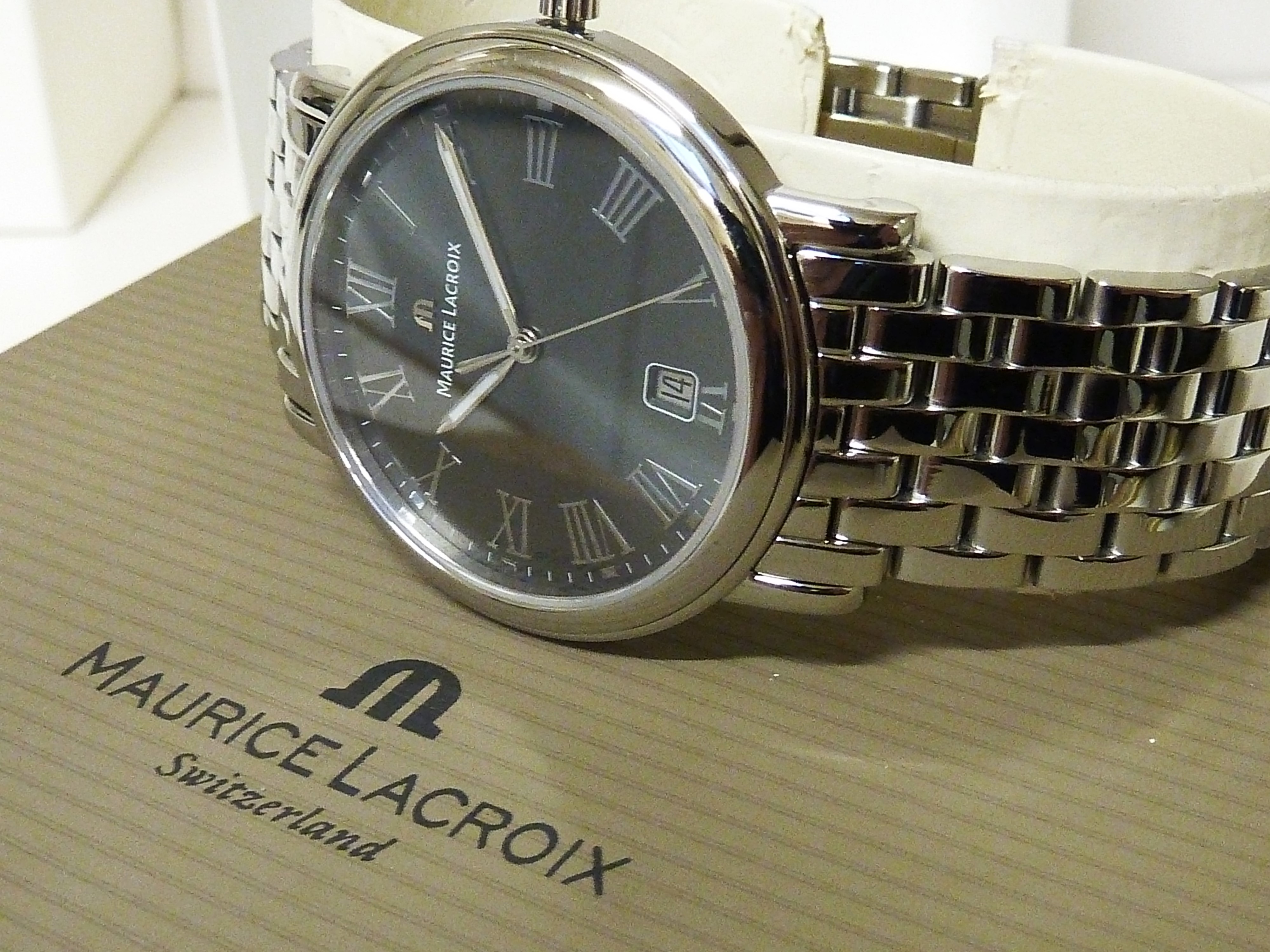 Maurice Lacroix quartz met datum, grijze wijzerplaat met romeinse cijfers.