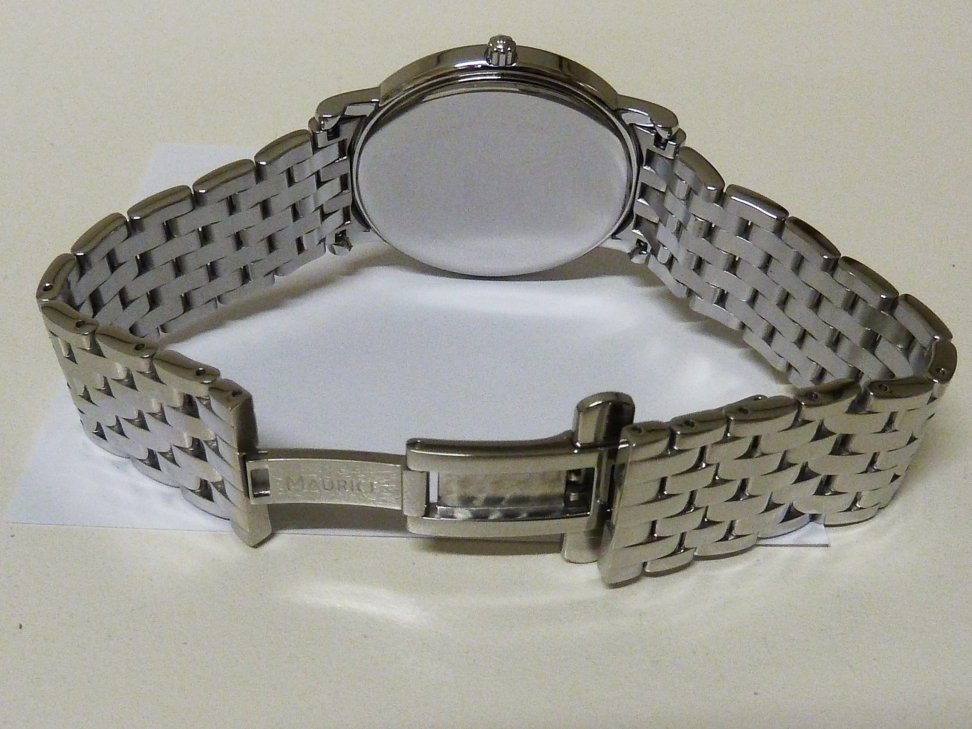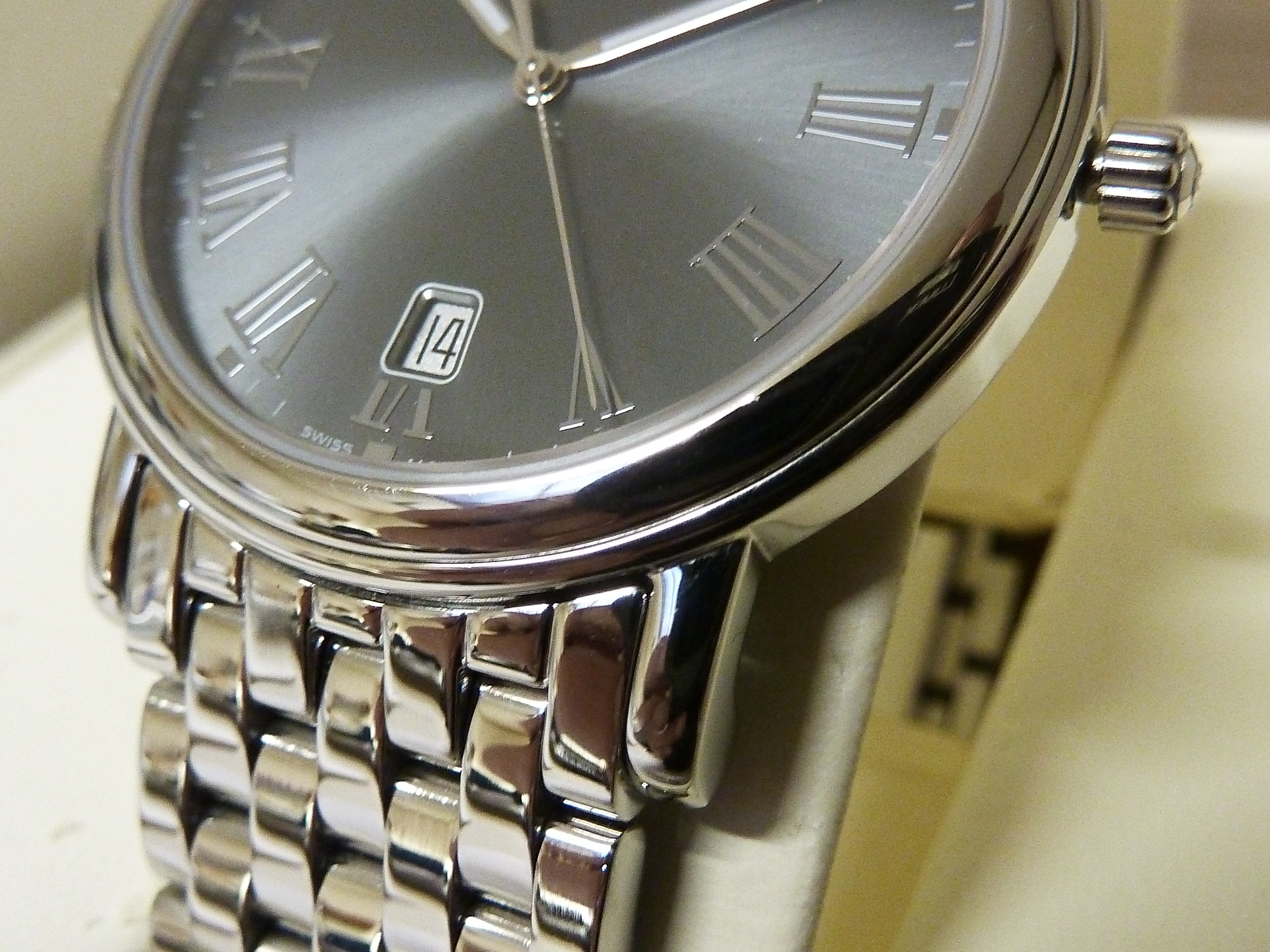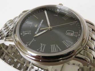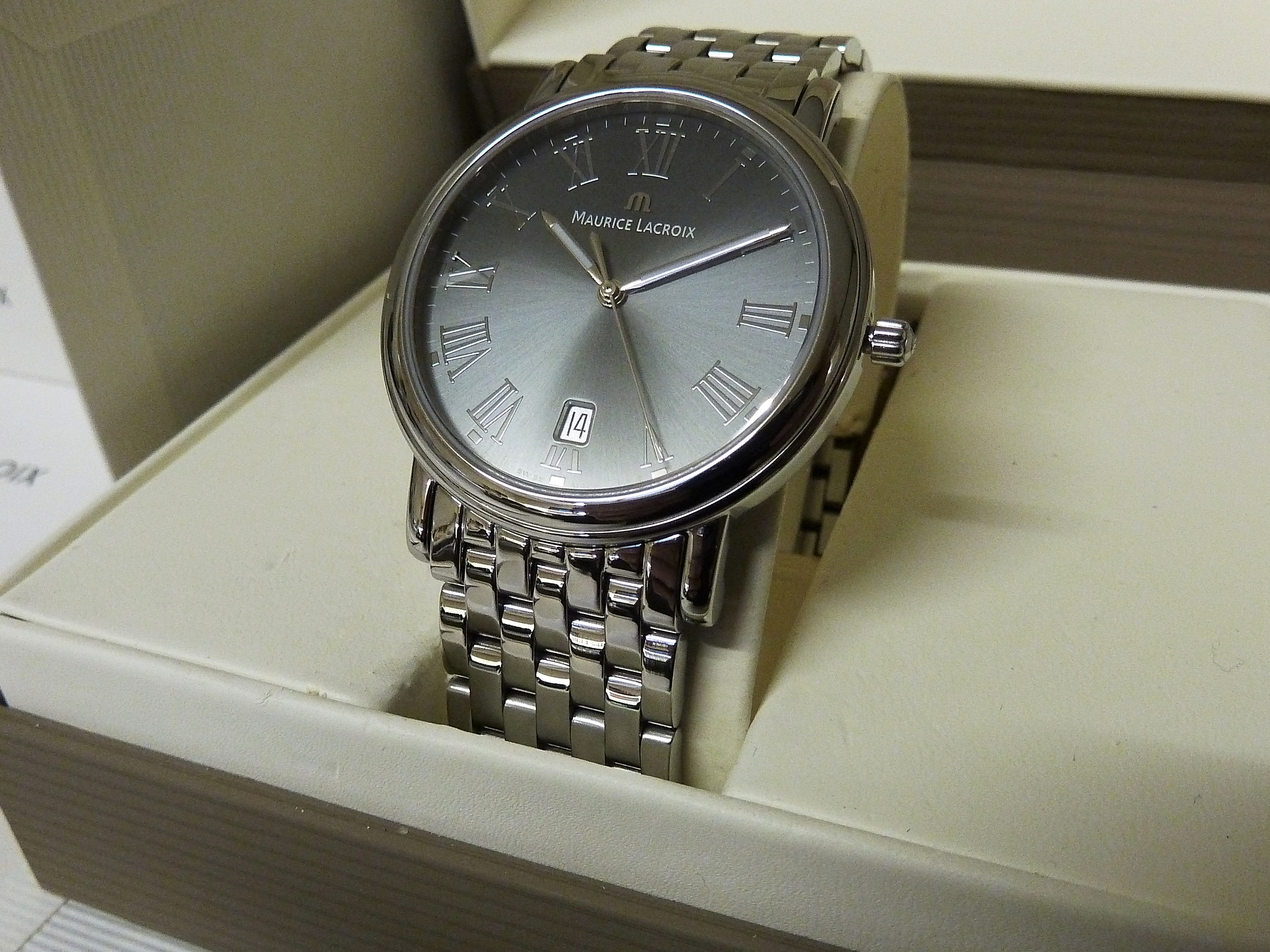 Maurice Lacroix quartz met datum, grijze wijzerplaat met romeinse cijfers.