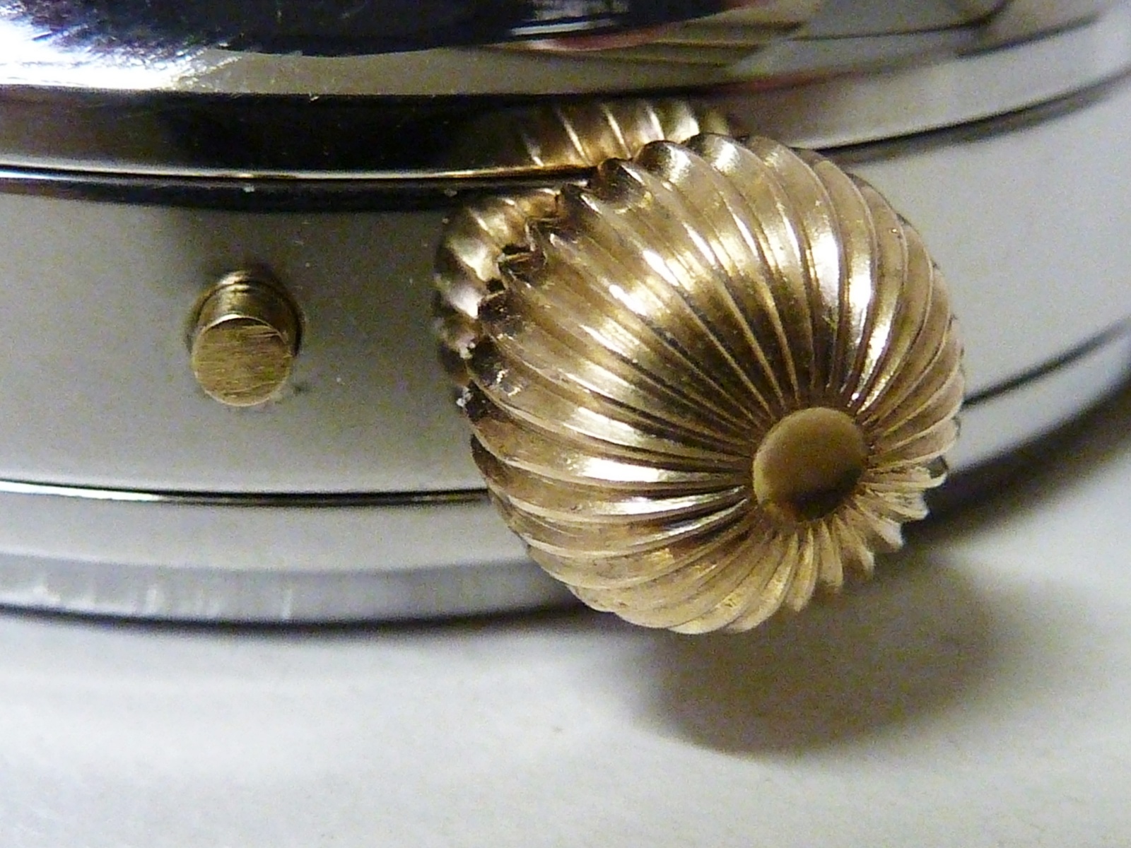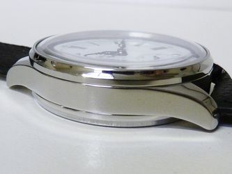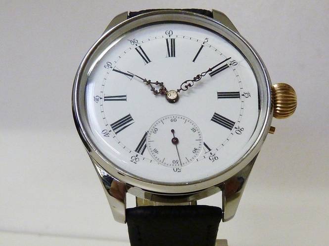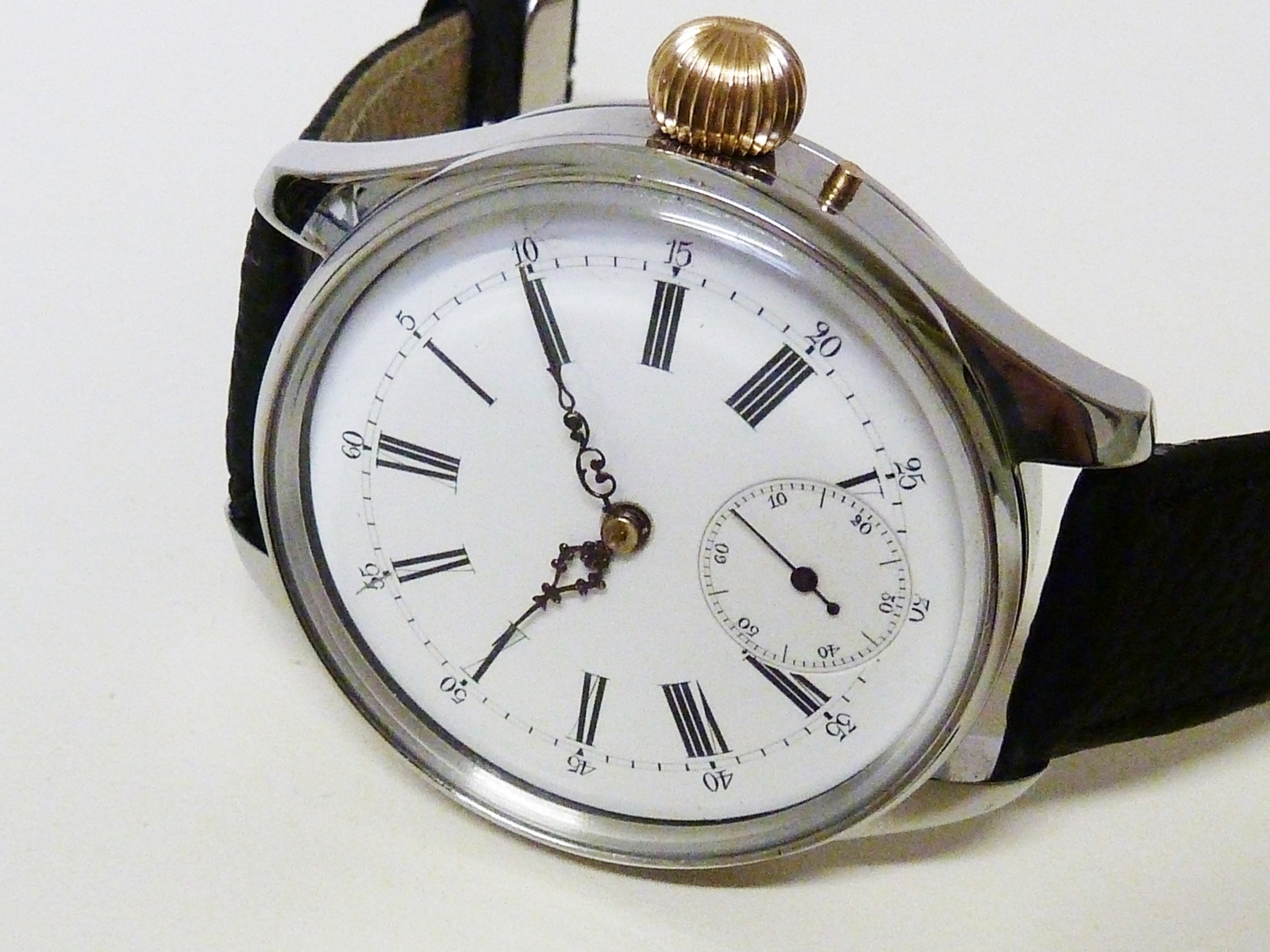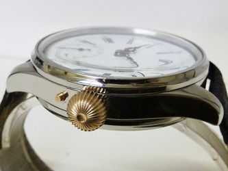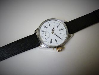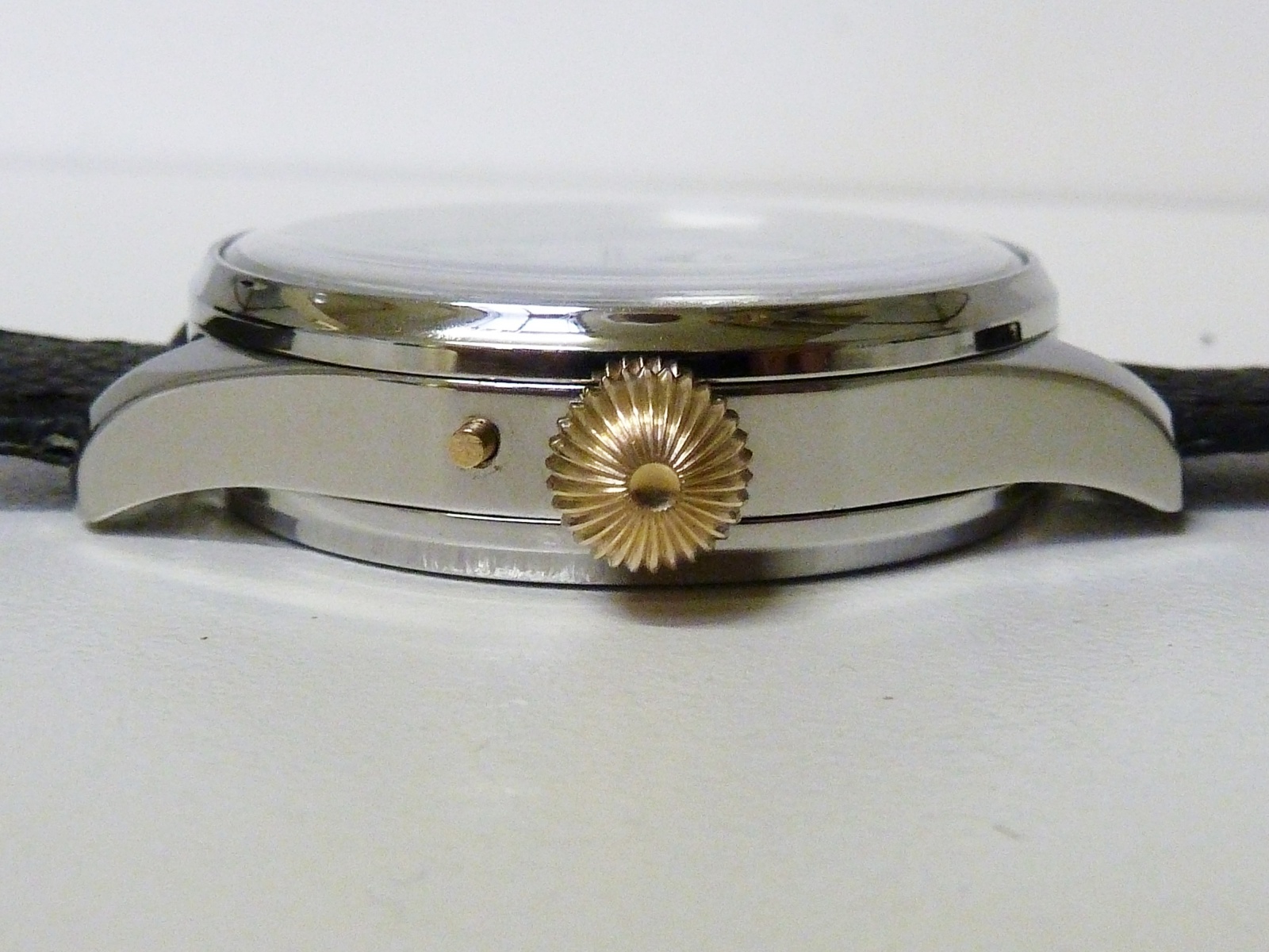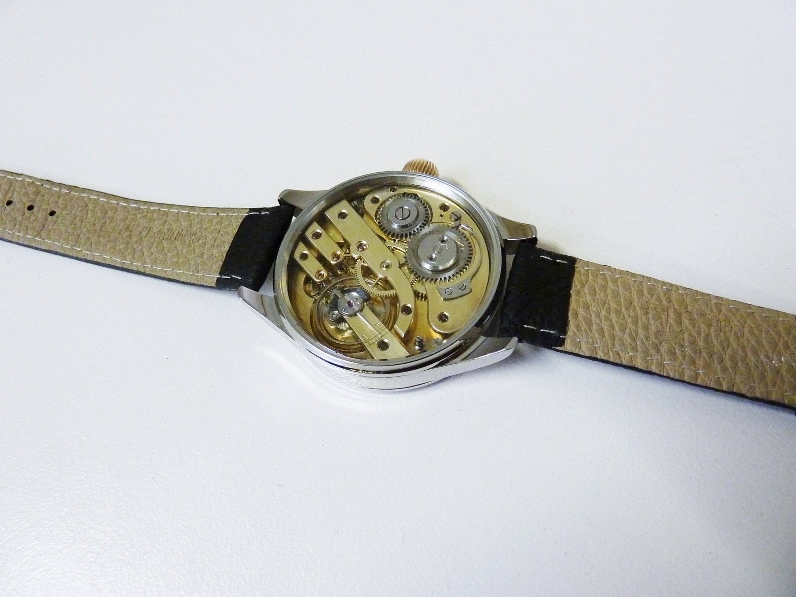 Speciaal op maat gemaakte edelstalenkast diameter 47,7 x 57 mm. hoogte 14 mm. met zichtvenster aan achterzijde met nieuwe lerenband.