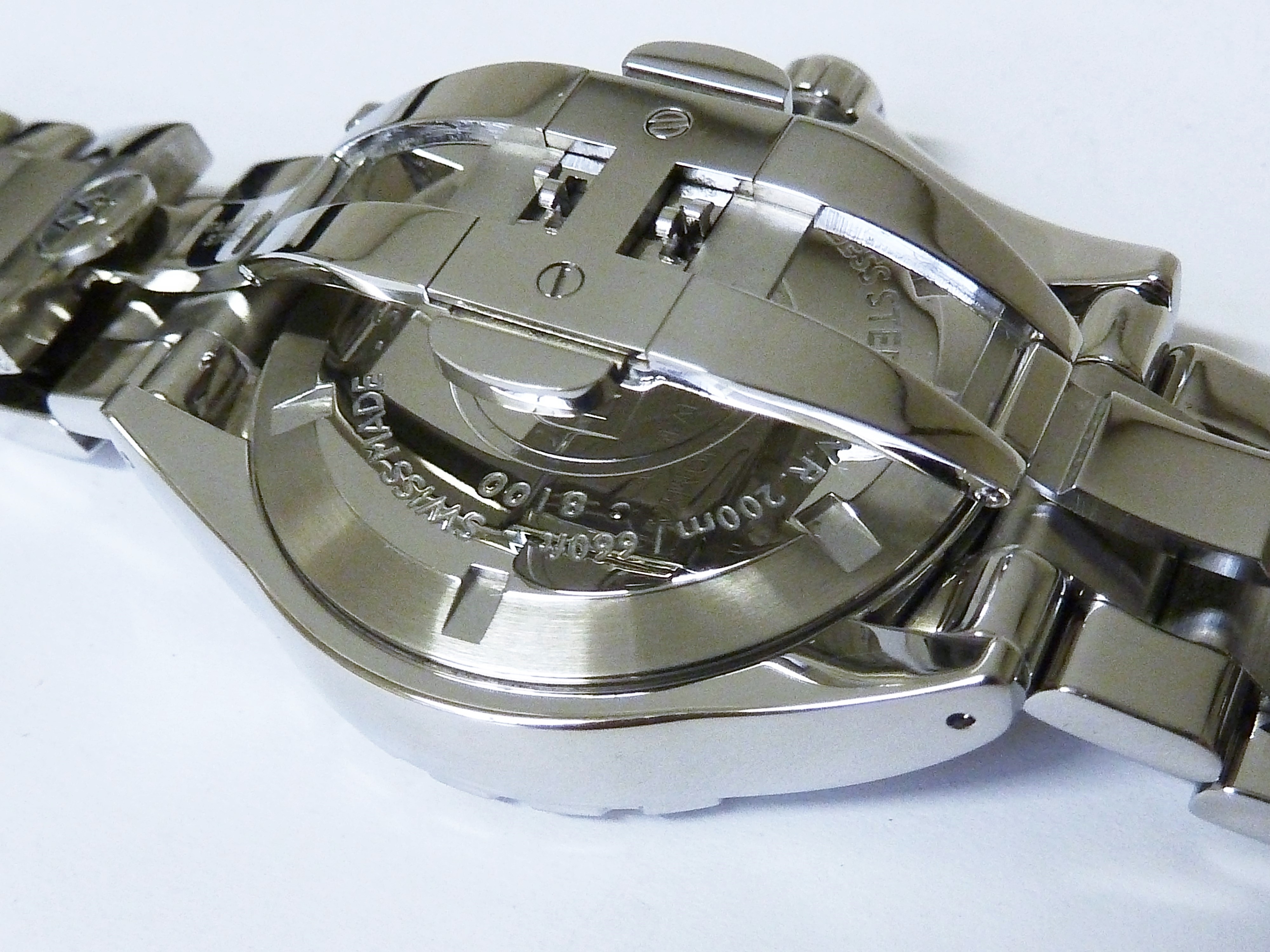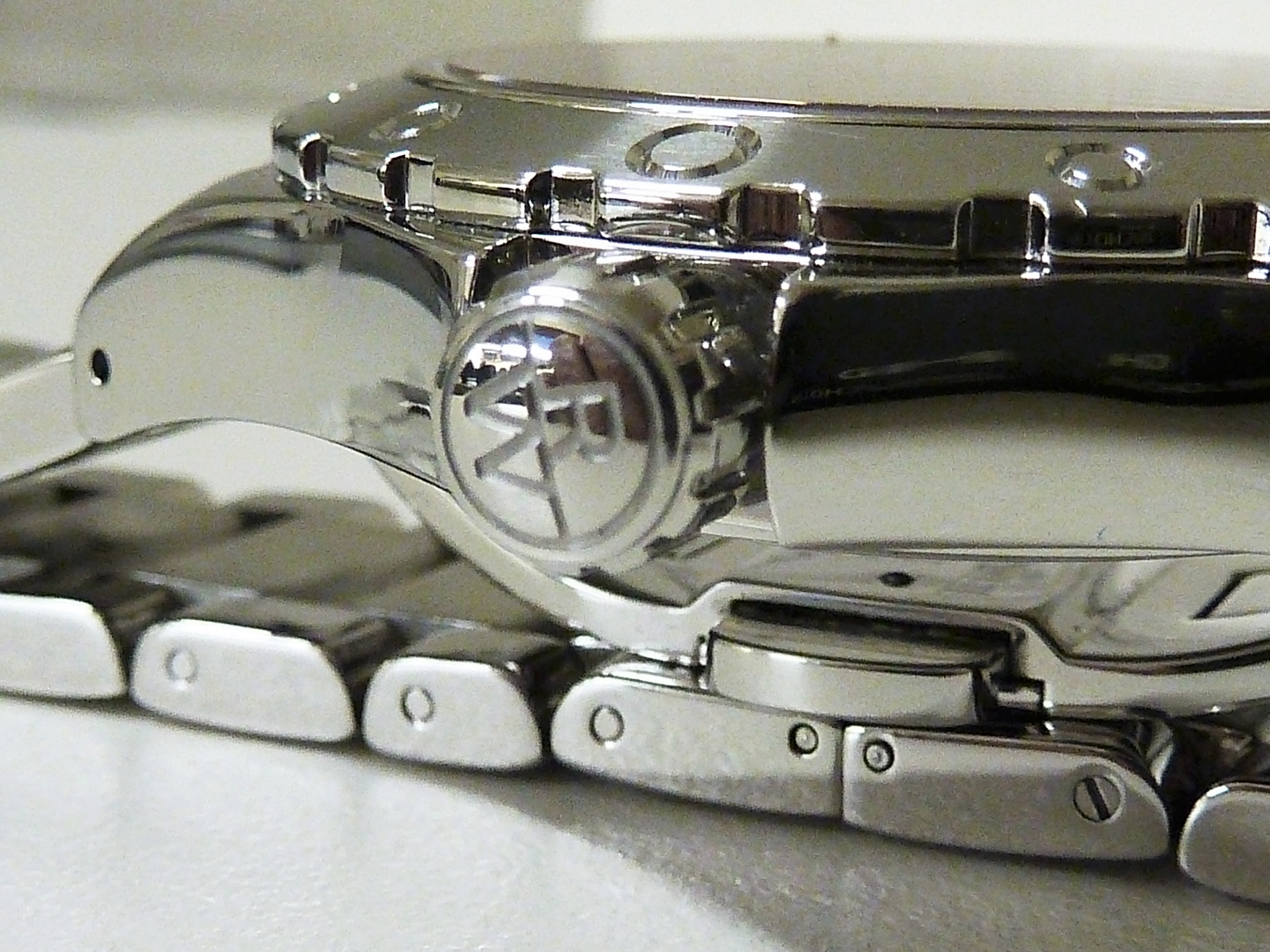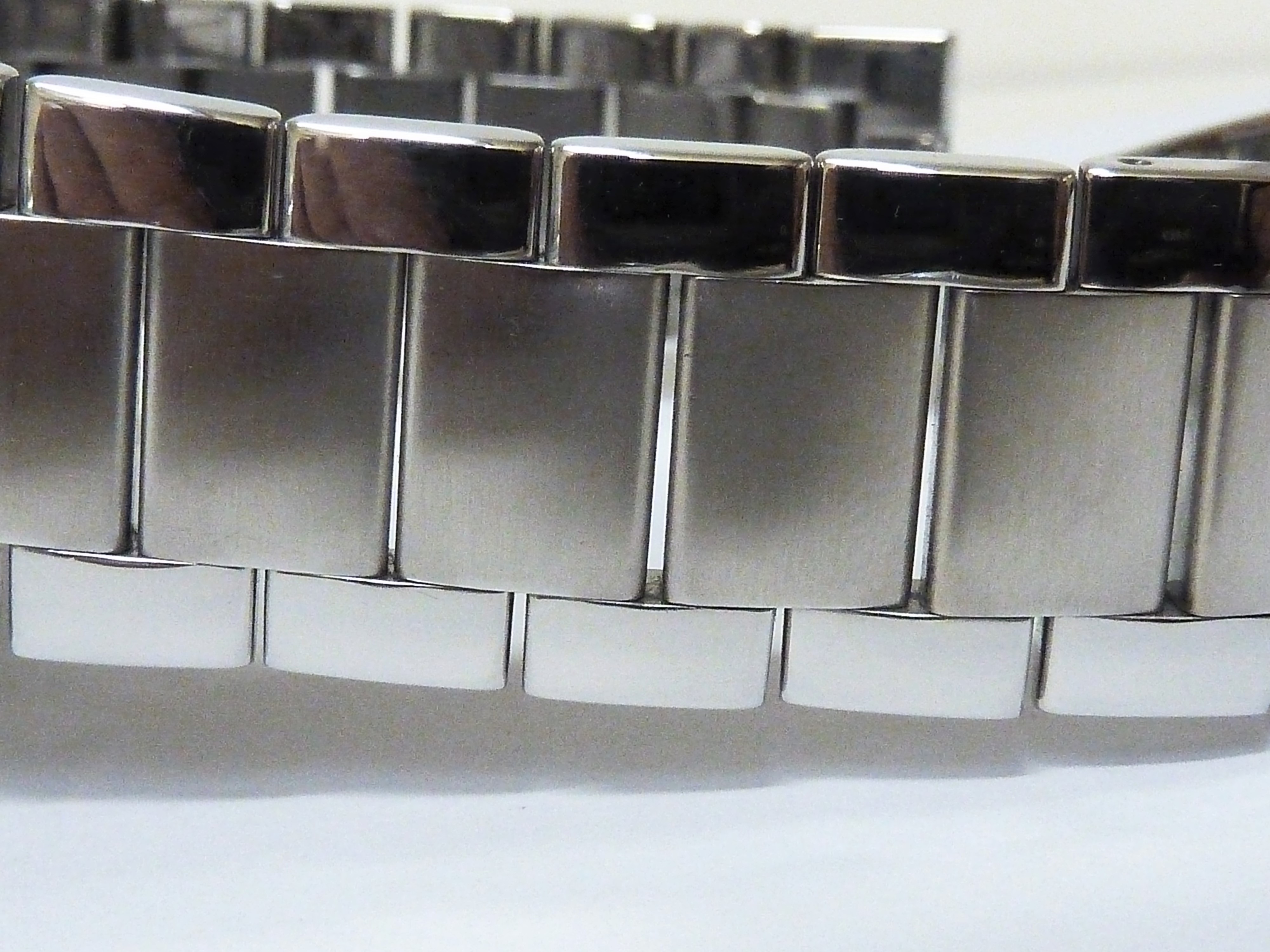 Edelstalenkast met stalenband prachtig gesatineerde en glanzende schakels met vlindersluiting, diameter 46 x 50 mm .hoogte 12 mm.