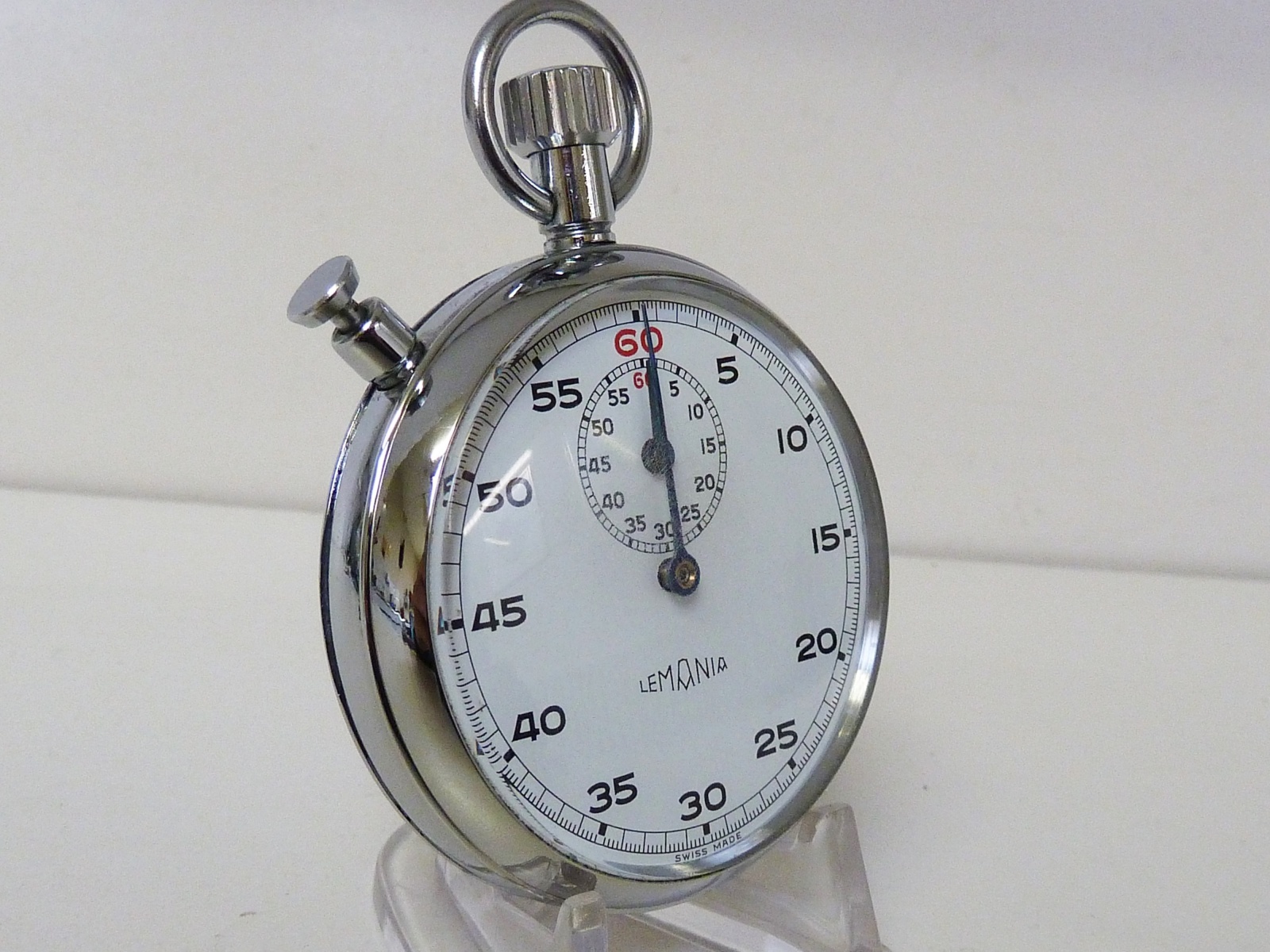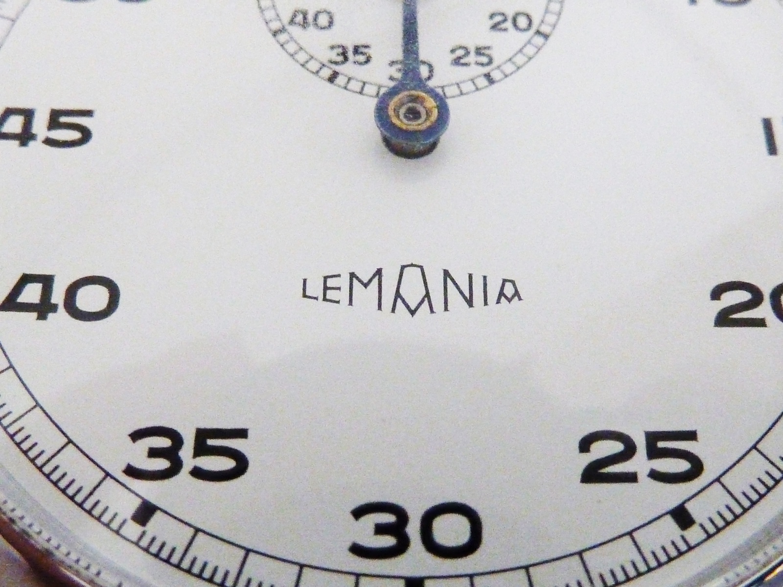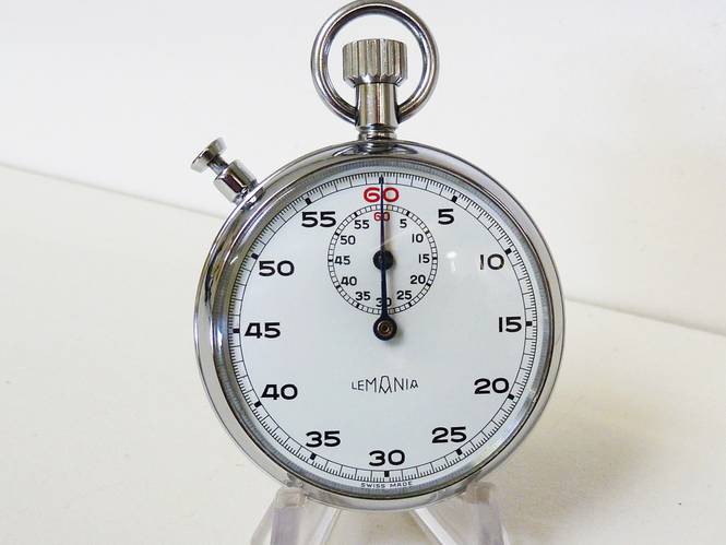 Lemania stopwatch, witte wijzerplaat, zwart arabische cijfers met 60 min.teller.