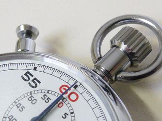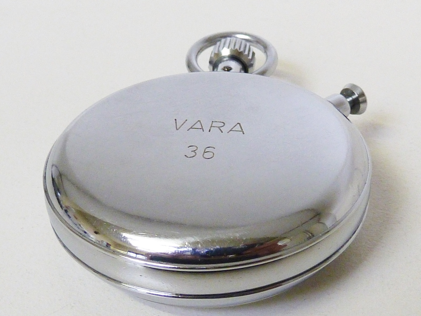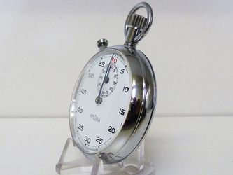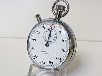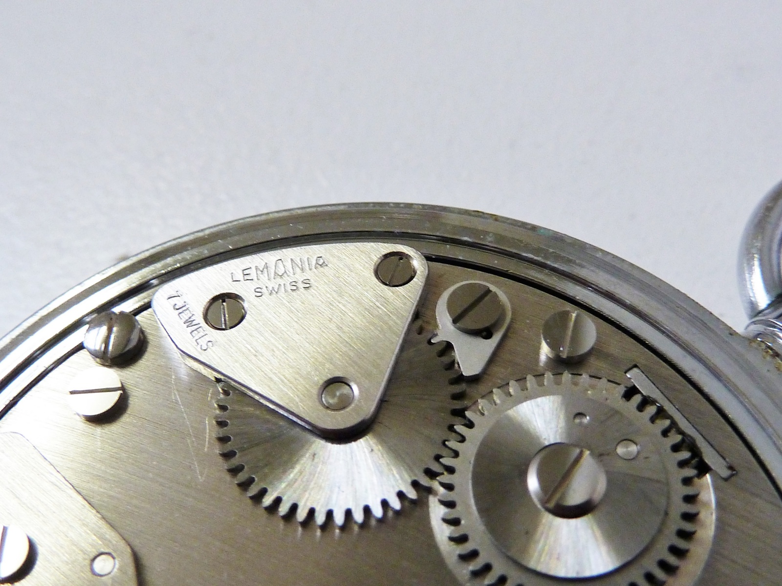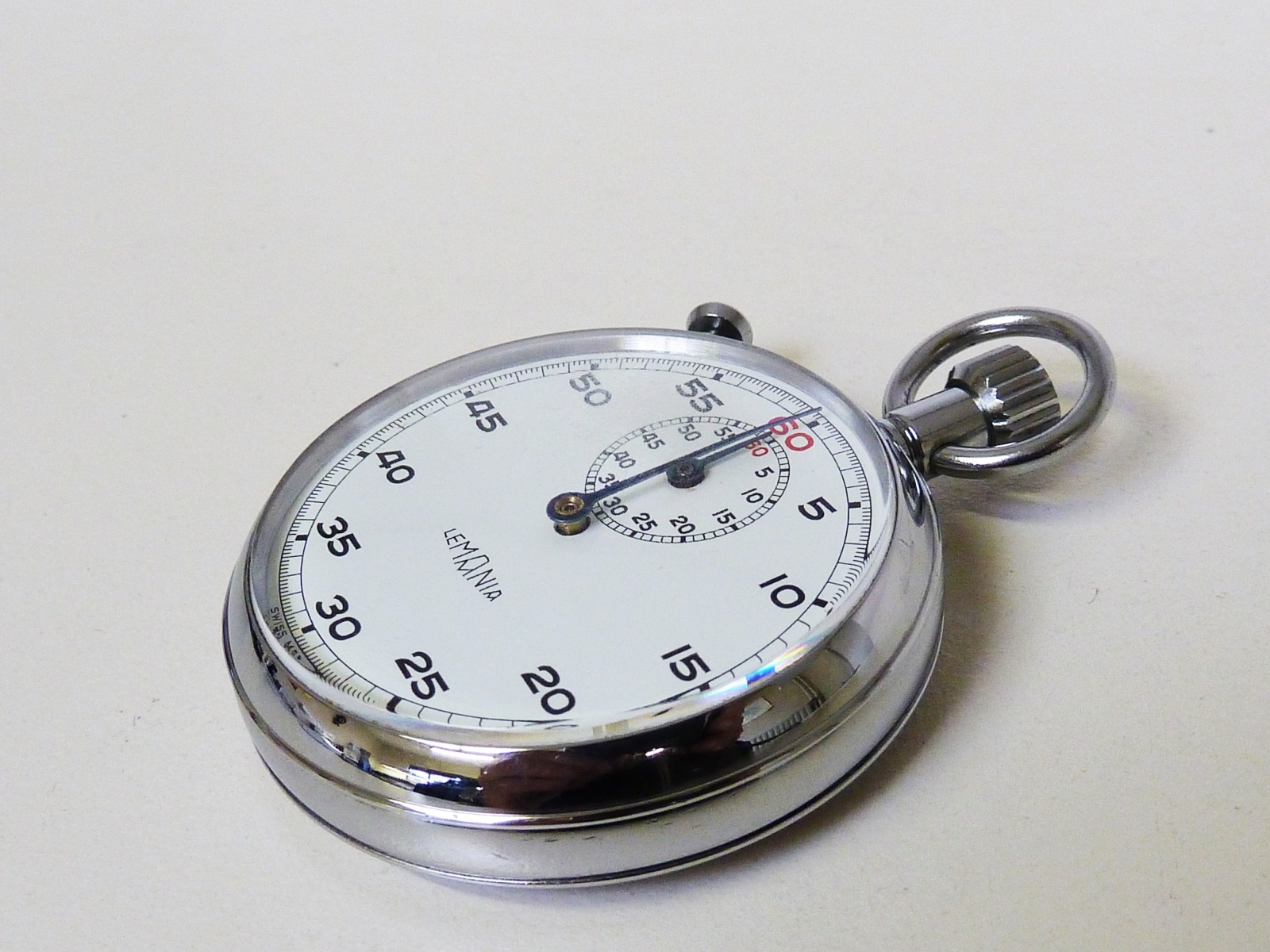 Lemania stopwatch, witte wijzerplaat, zwart arabische cijfers met 60 min.teller.