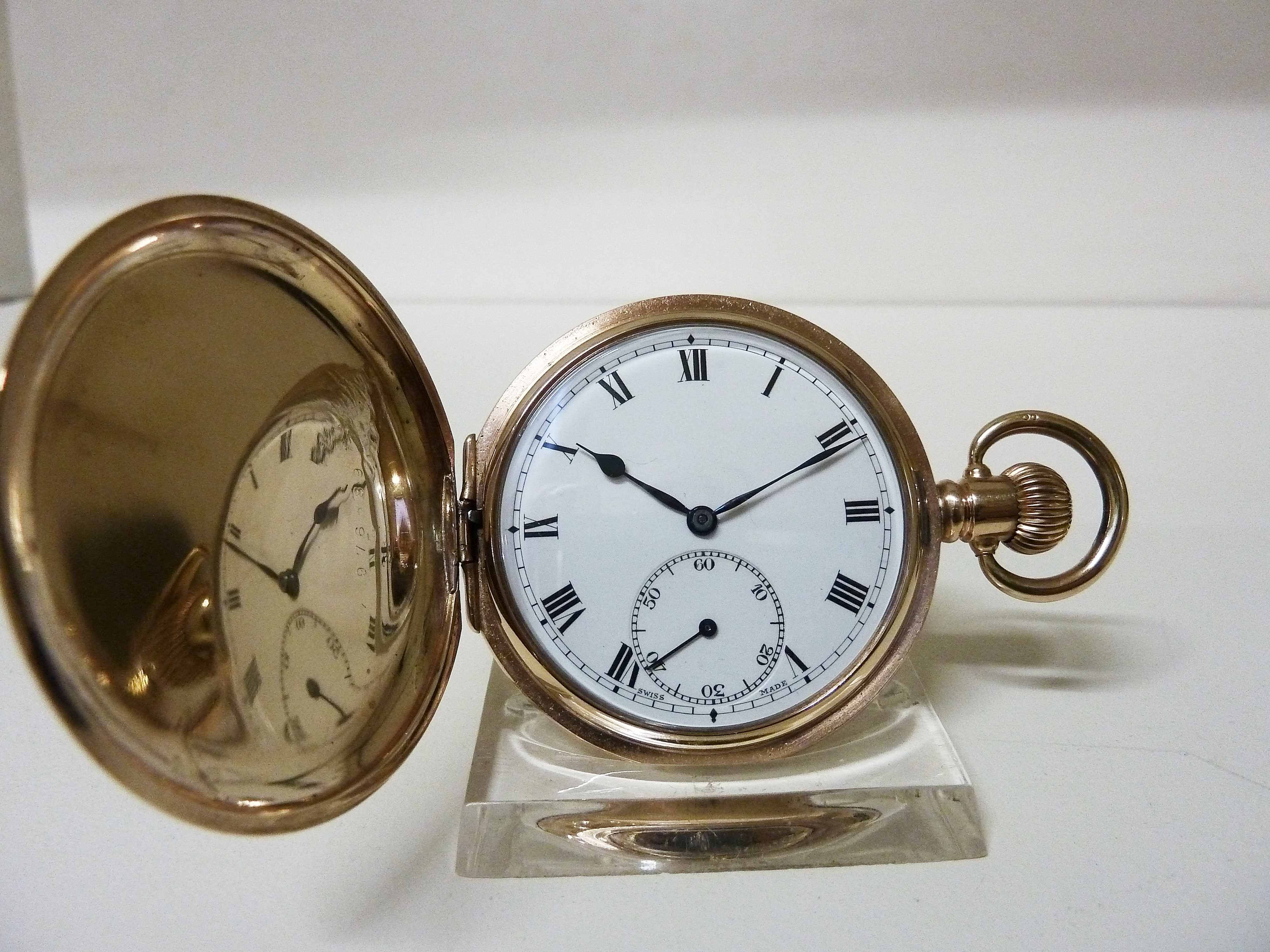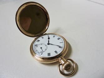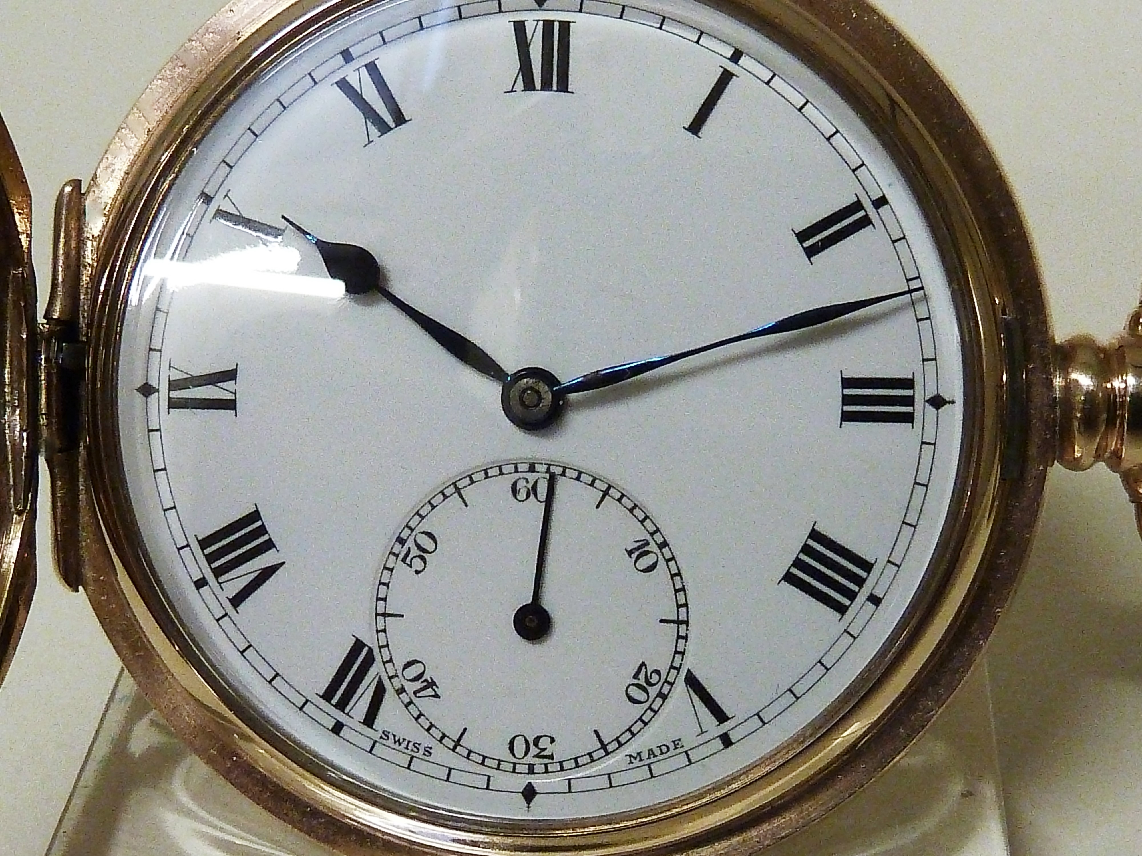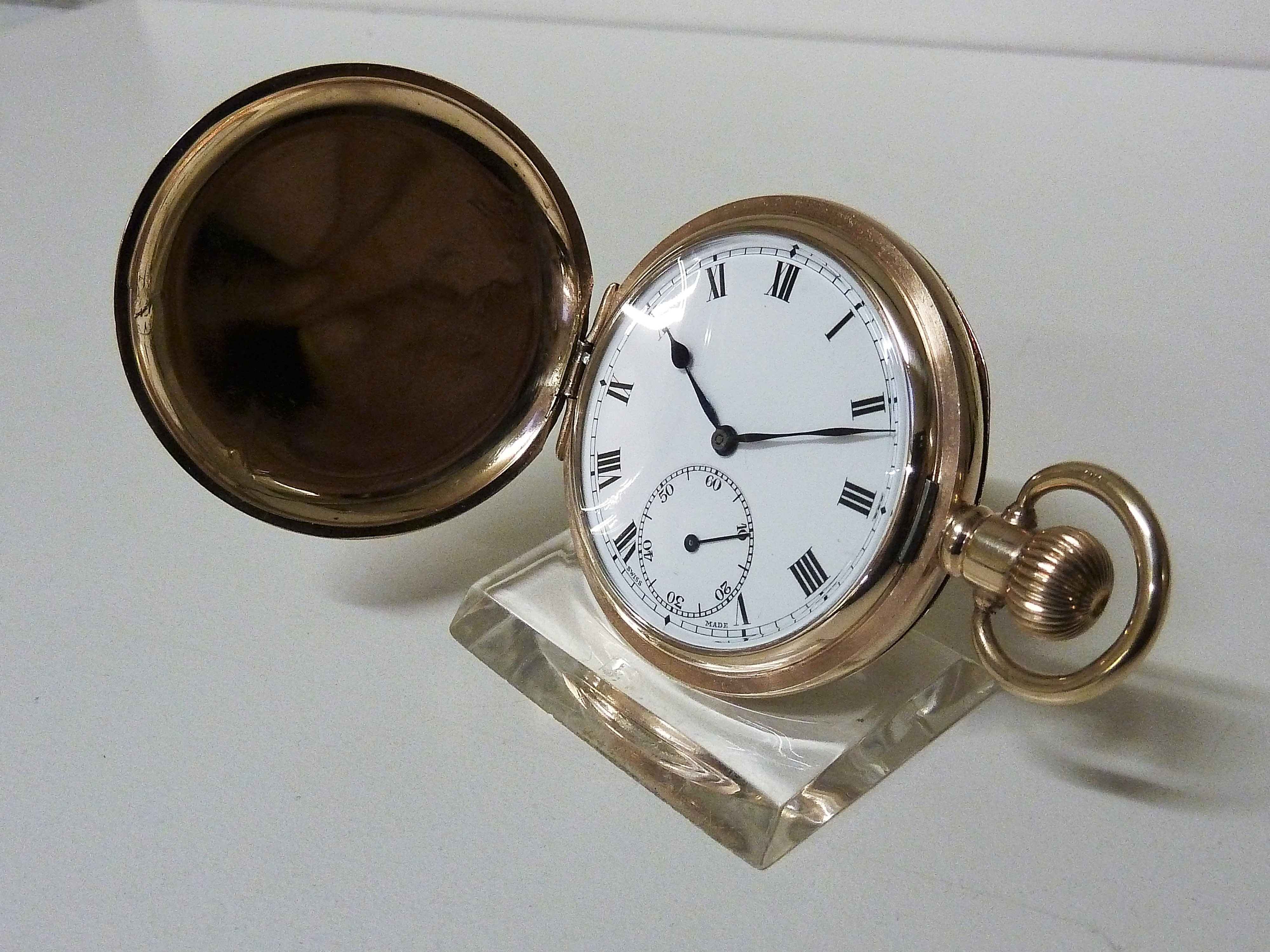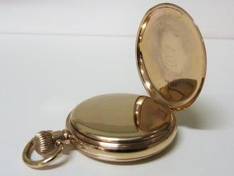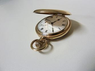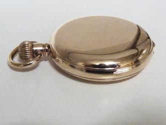 Verguldenkast savonnet diameter 50 mm. hoogte 14 mm. met geemaileerde witte wijzerplaat.